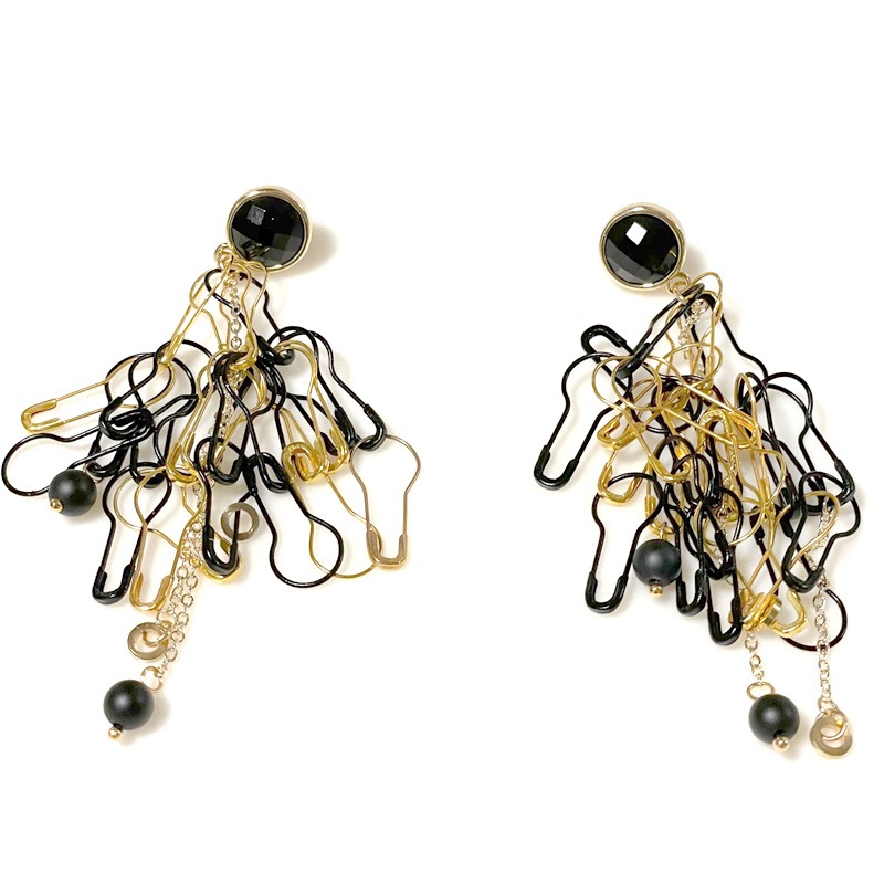 オニキスのピアスポストにランダムにブラックとゴールドのピンをつなげて、