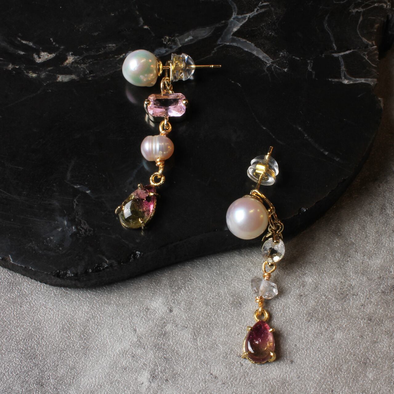 艶やかなあこやバロックパールを主役に、多彩な天然石チャームを組み合わせた遊び心あふれるピアスです。