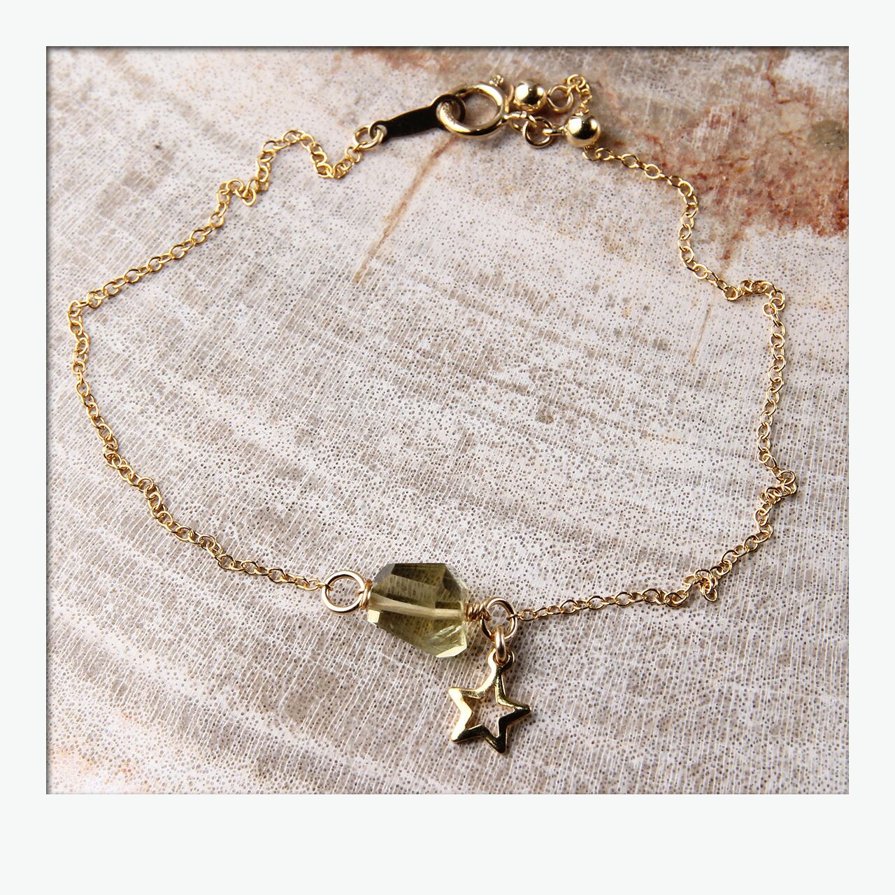 ラフな形を残したタンブルカットのオリーブクォーツを星のチャームつきブレスレットにしました。
