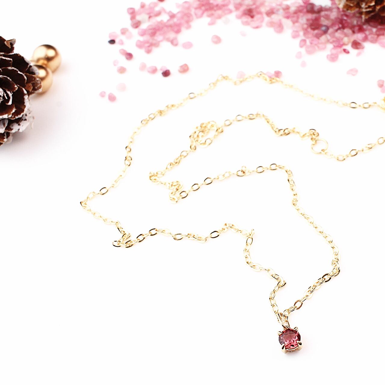 透明感のある優しいピンクが魅力の 天然ピンクトルマリン を、K10イエローゴールドの繊細な輝きで包み込んだプチネックレス。