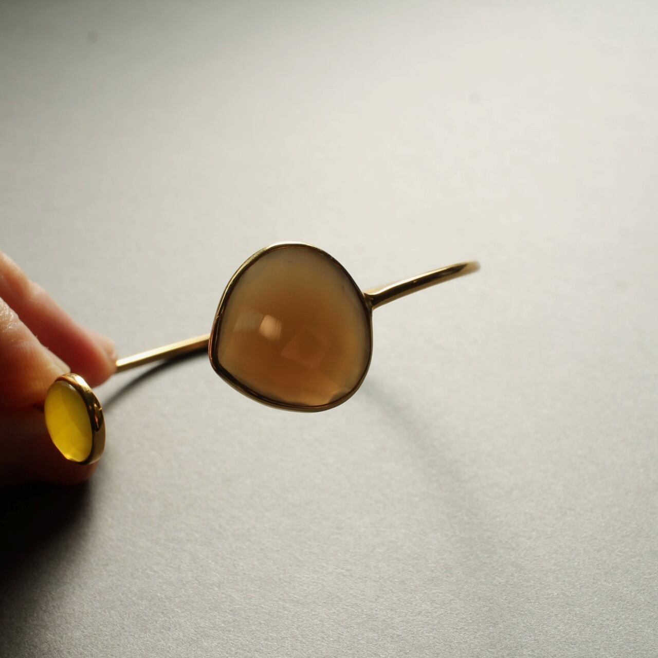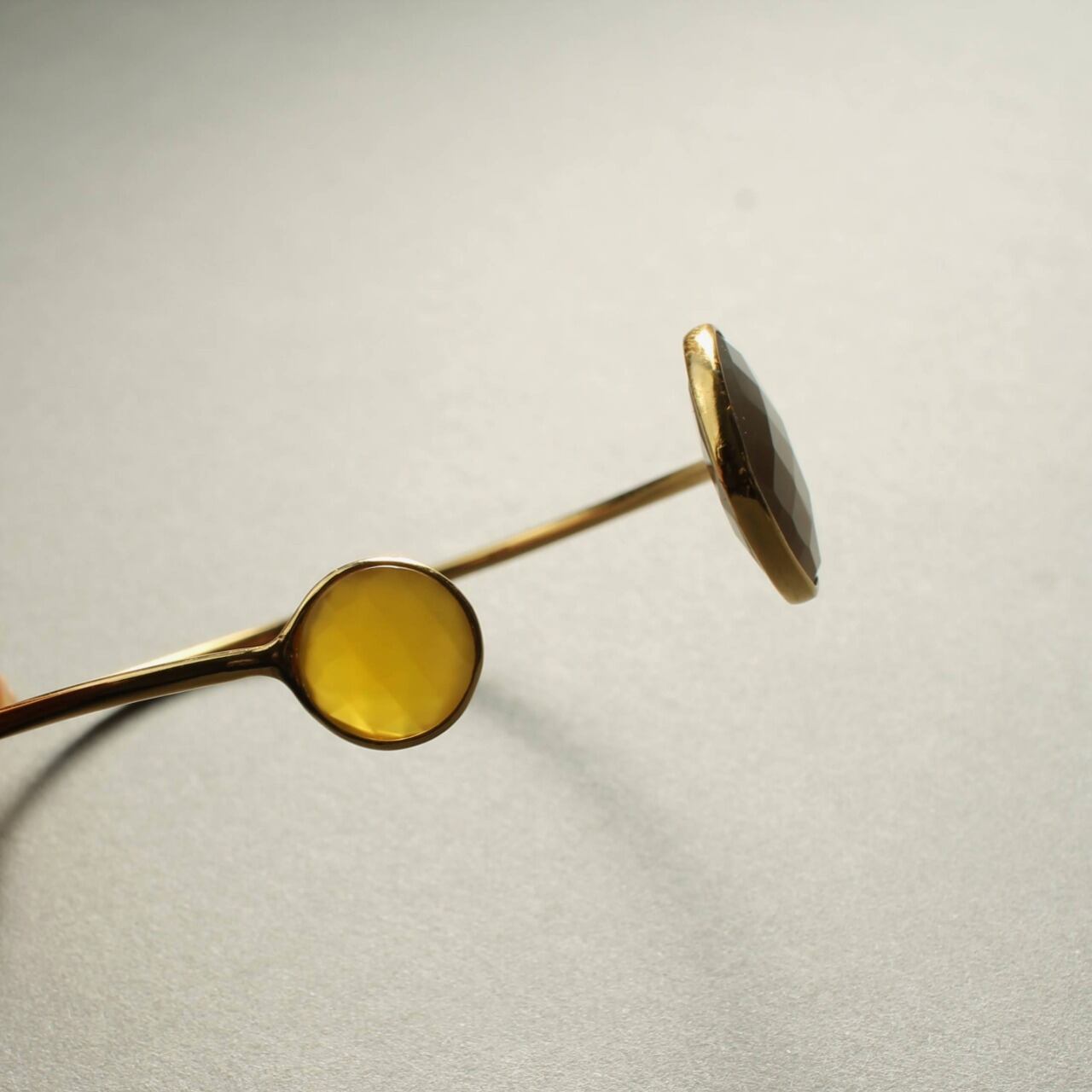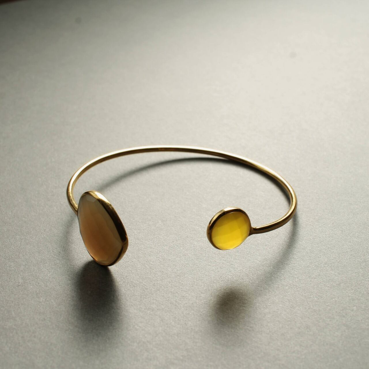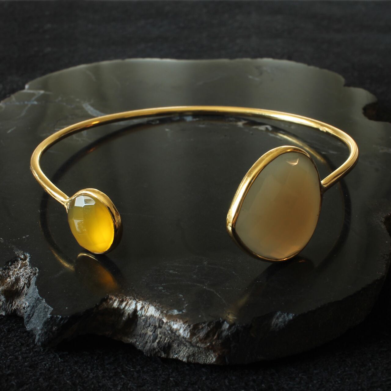 落ち着いた グレーカルセドニー と、温かみのある イエローカルセドニー を組み合わせた洗練されたバイカラーバングル。