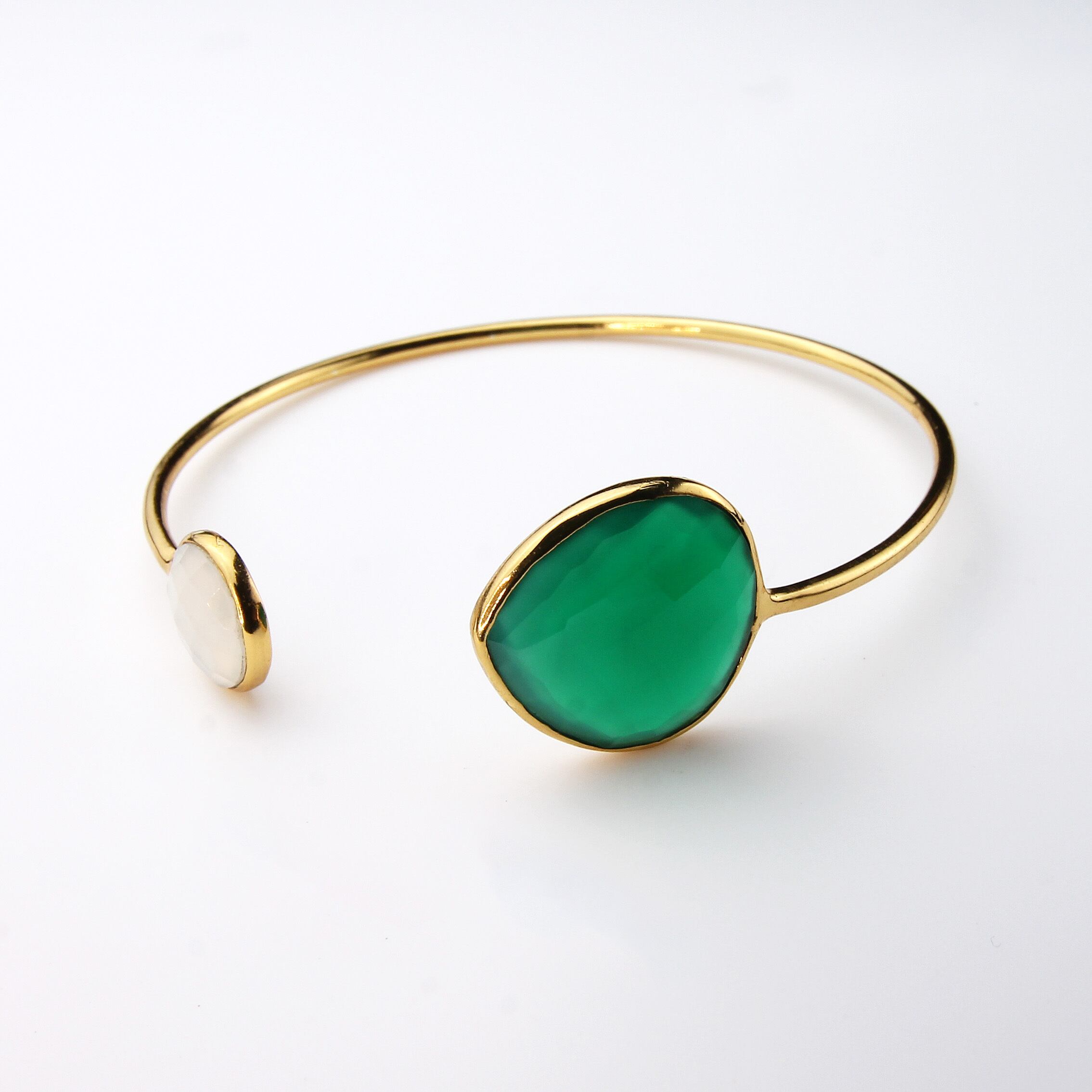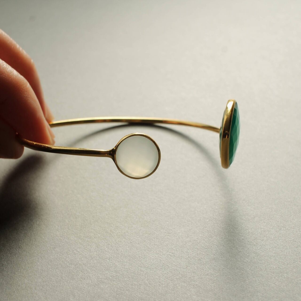 鮮やかな グリーンオニキス と、優しく透き通る ホワイトカルセドニー を組み合わせた、美しいコントラストが魅力のバングル。