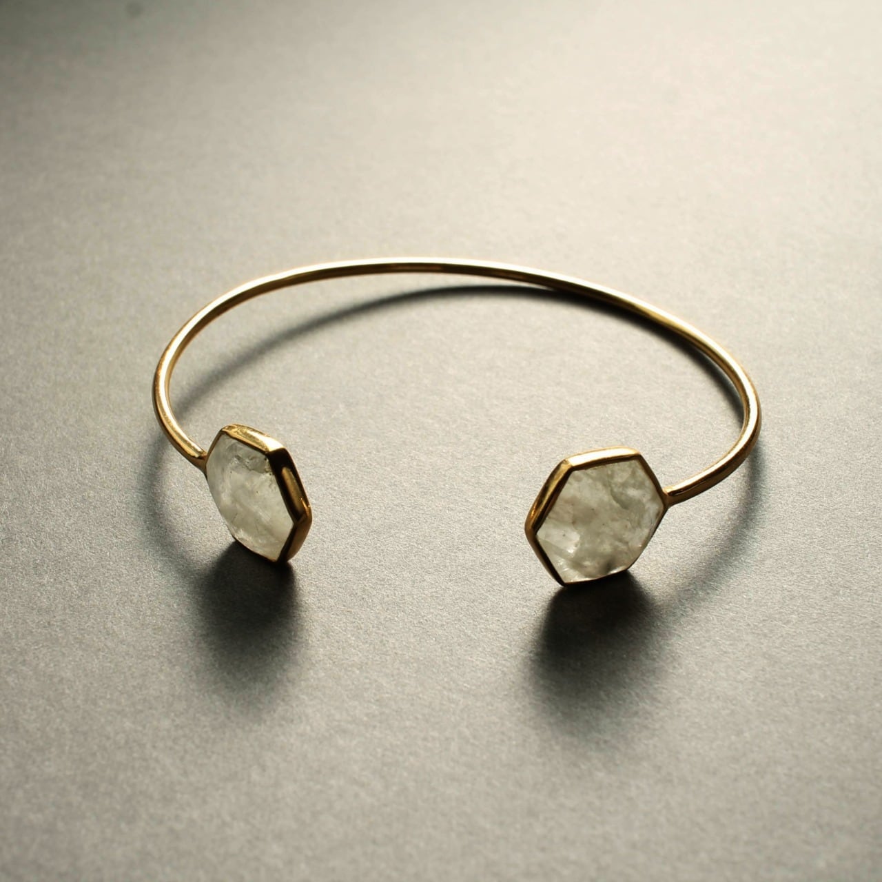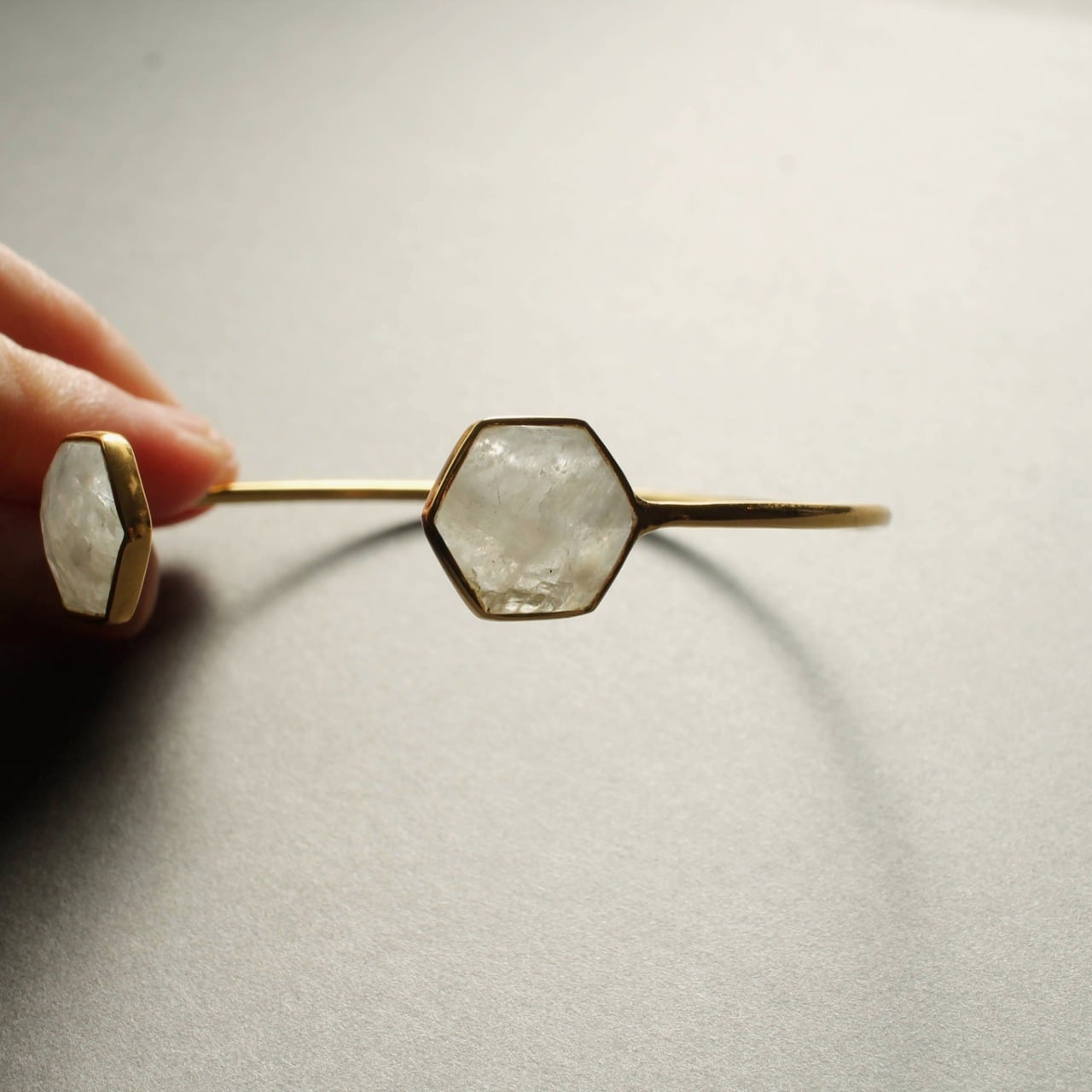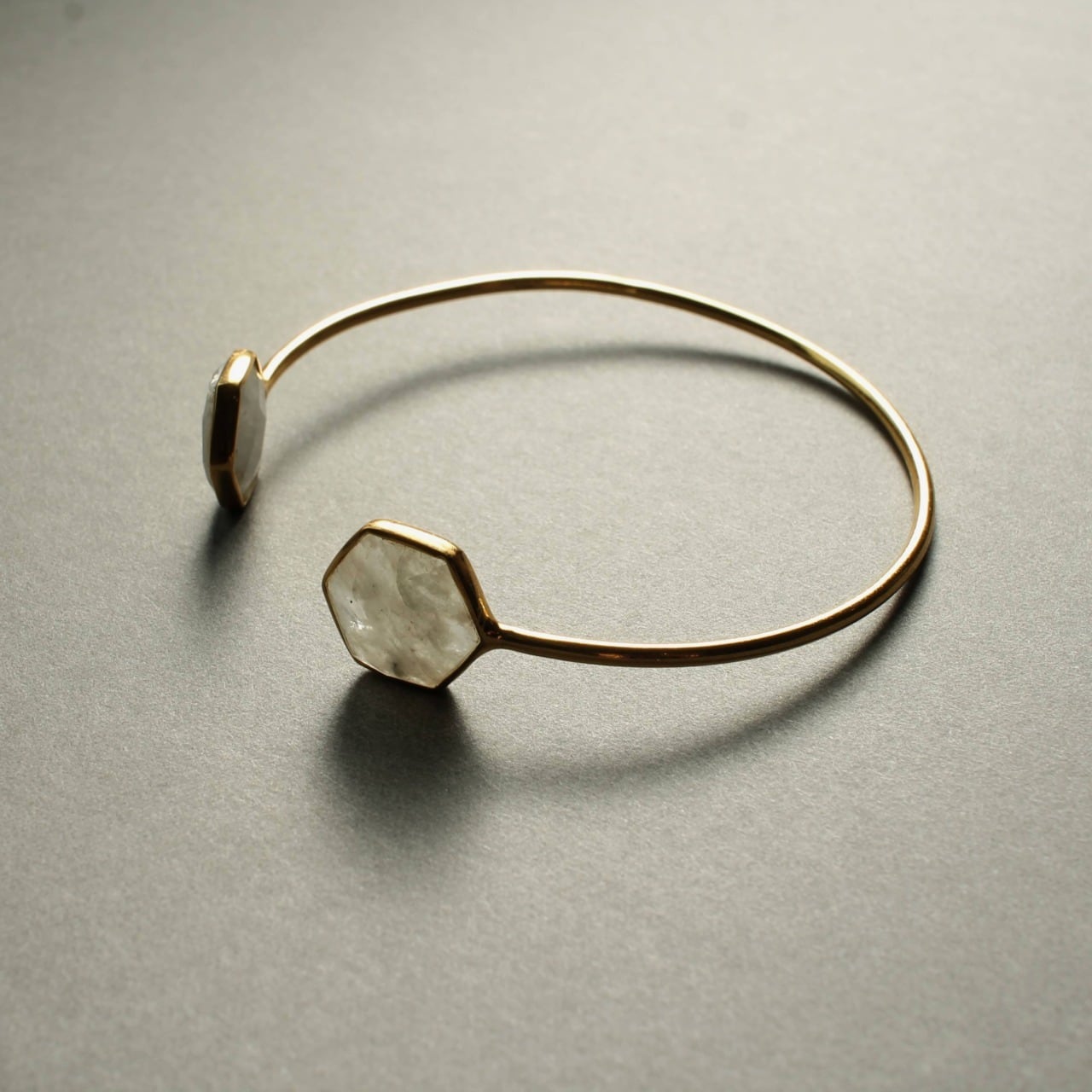 六角形(ヘキサゴン)にカットされた 天然レインボームーンストーン をあしらった、エレガントなバングル。