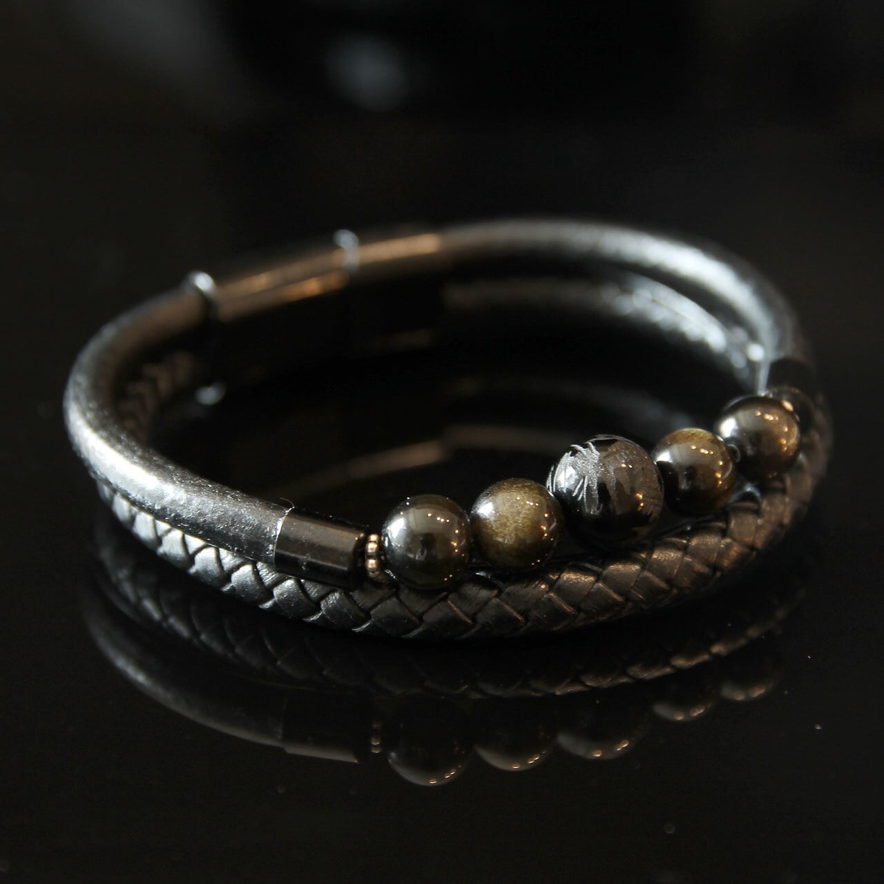 希少石のゴールデンシャインオブシディアンの中心にブラックオニキスの青龍を配したブレスレット。