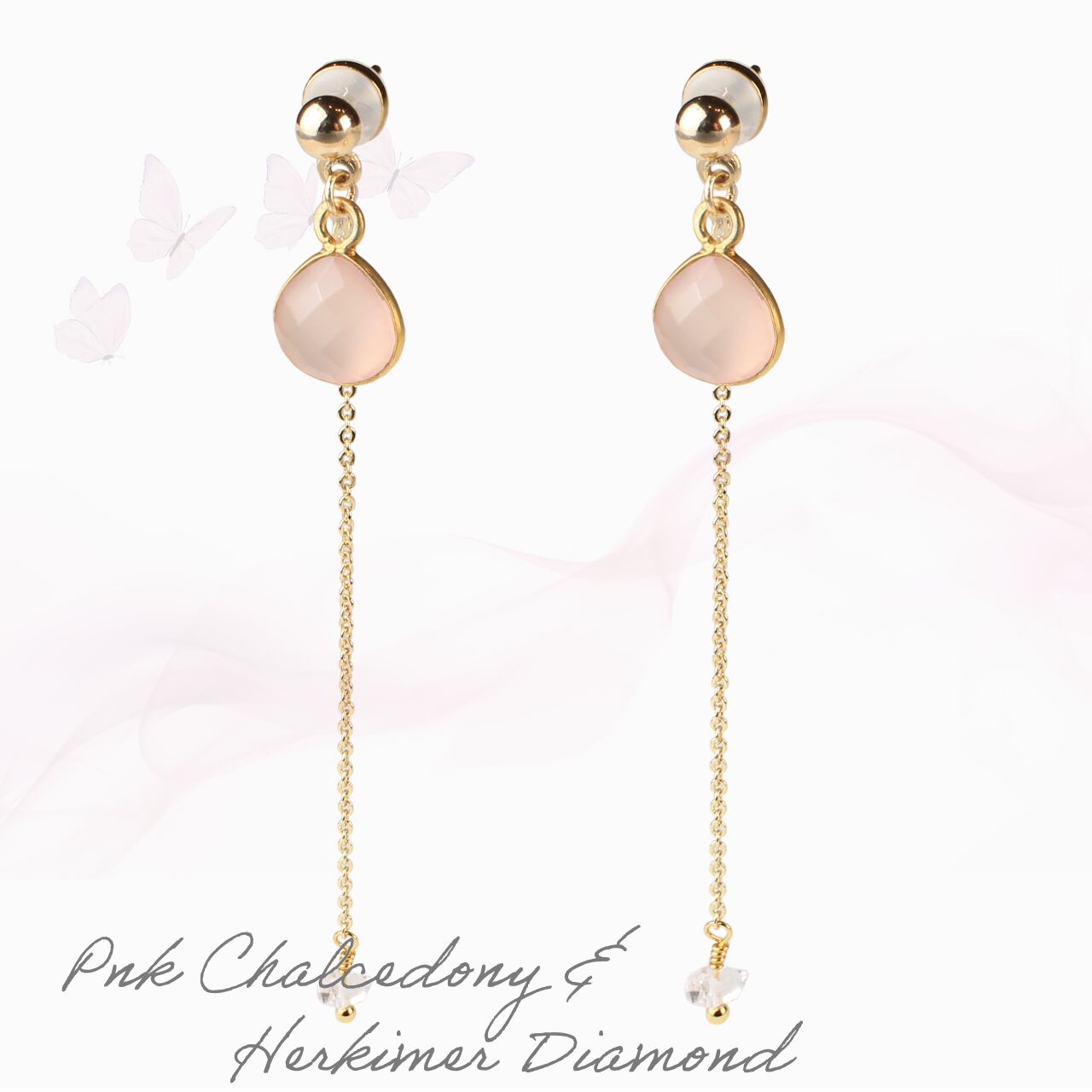 【フェミニンカラー】ピンクカルセドニ― キャッチチェーンピアス