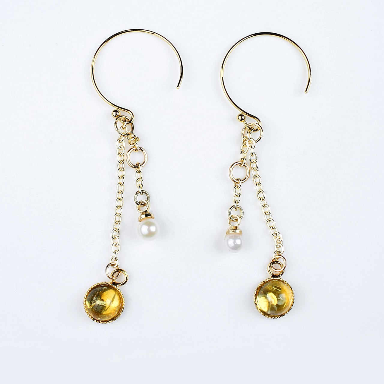 明るくハッピーなイメージのイエロカラーアンバー(琥珀)と、上品な光沢を放つあこやベビーパールを組み合わせたエレガントなフックピアス。
